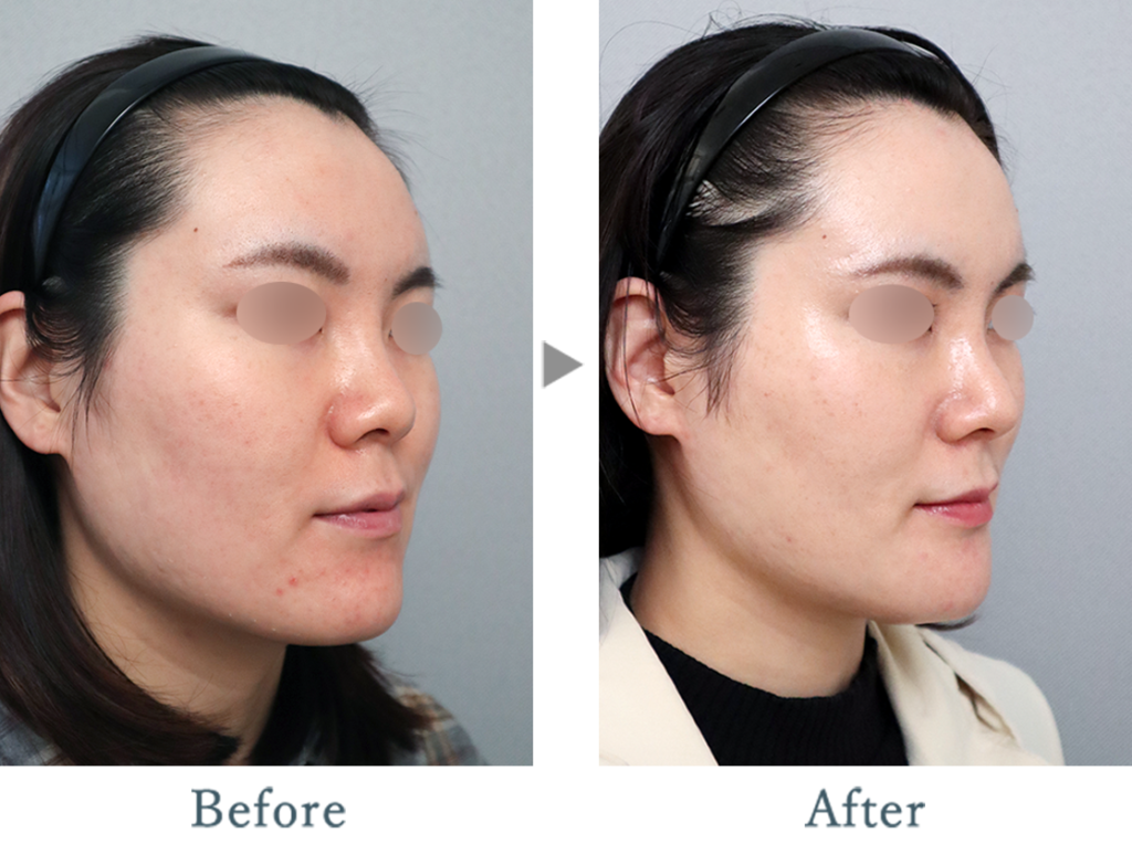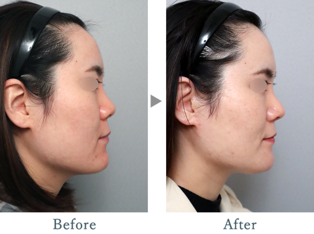 こちらの患者さんは骨格よりも咬筋の発達が目立ちましたので、患者さんと相談し、エラはボトックスのみで対応しました。